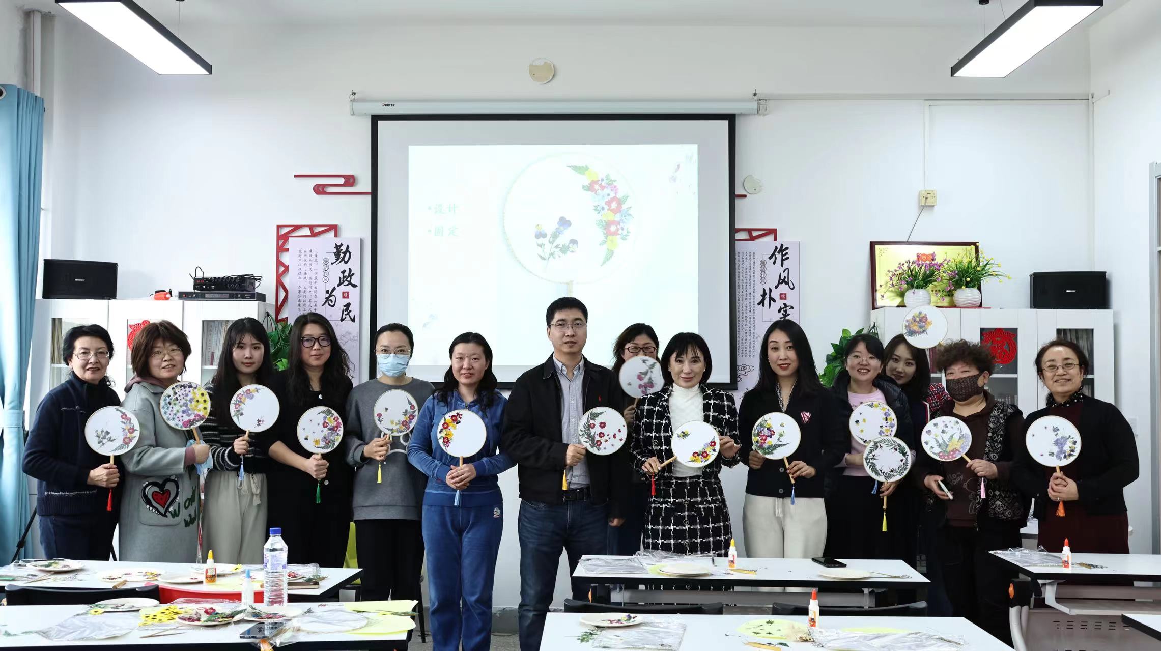 活动中,大家热情高涨,相互借鉴学习,选着自己喜欢的花材,巧妙构思、精心制作,在团扇上粘贴干花实物,呈现出了一幅幅生动的图画,原本一片空白的团扇,在众人精心制作下变成了一把把色彩斑斓的“艺术品”。现场氛围轻松暖人,花材在老师们手中变换,笑容在老师们脸上流转,大家享受着亲手制作的乐趣,一把把团扇创意十足、风格各异,渐次展现在大家面前。大家纷纷表示,能在其乐融融的氛围中为自己制作一份特别的节日礼物,感觉非常轻松愉悦,是一次非常温暖而难忘的节日体验。